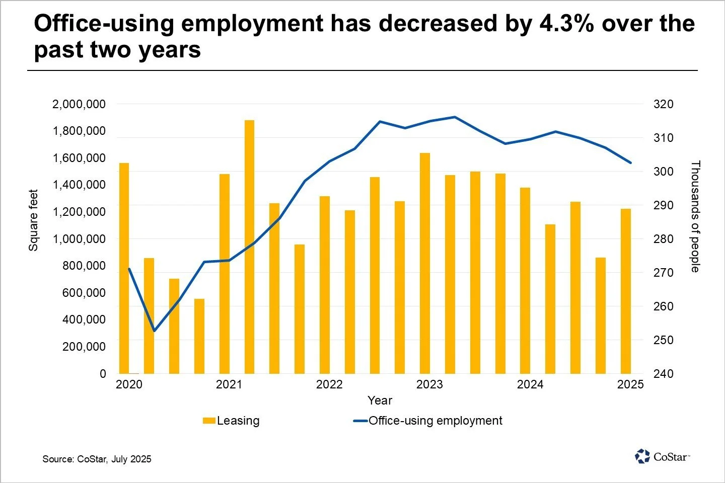 Nashville's commercial real estate market is experiencing a notable softening in office demand, driven by significant job losses in key sectors. According to recent U.S. Bureau of Labor Statistics data, the city lost 4,600 office-using jobs in May compared to the previous year, with professional and business services down 1.6%, financial activities declining 1.5%, and information sector jobs dropping 0.6%. This employment decline has directly impacted office leasing activity, which decreased by over 11% during the same period, contributing to Nashville's office vacancy rate reaching its highest level in over 25 years.